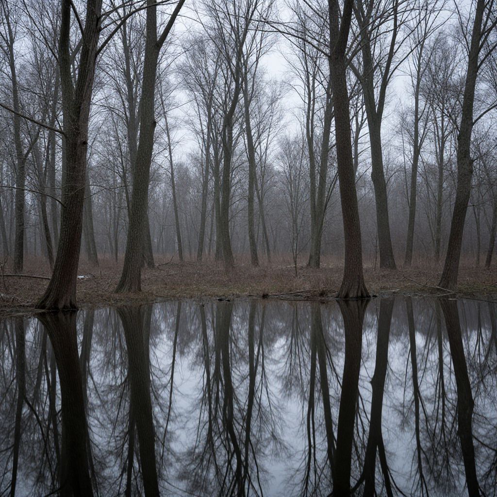An ethereal forest of bare trees stands solemnly amidst a mirror-like expanse, reflecting not just the sky above but the quiet whispers of forgotten dreams and the lingering echoes of childhood innocence, inviting introspection into the depths of memory and the transience of time.
