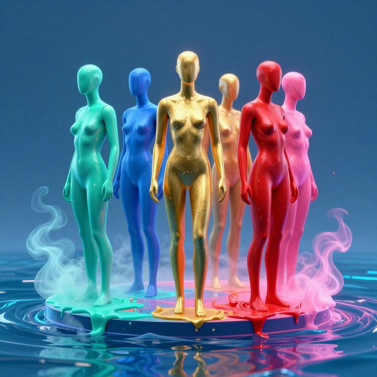 Photorealistic CGI image of six faceless, nude human figures standing on a floating platform in a blue gradient background. The figures are colored in vibrant hues: gold, blue, cyan, pink, and red, with varying skin tones and slight breast differentiation. They stand in a semi-circle, each enveloped in a glowing, ethereal aura. The platform is surrounded by rippling water, enhancing the surreal, otherworldly feel. The figures' smooth, glossy textures contrast with the soft, translucent flames surrounding them, creating a striking visual effect.