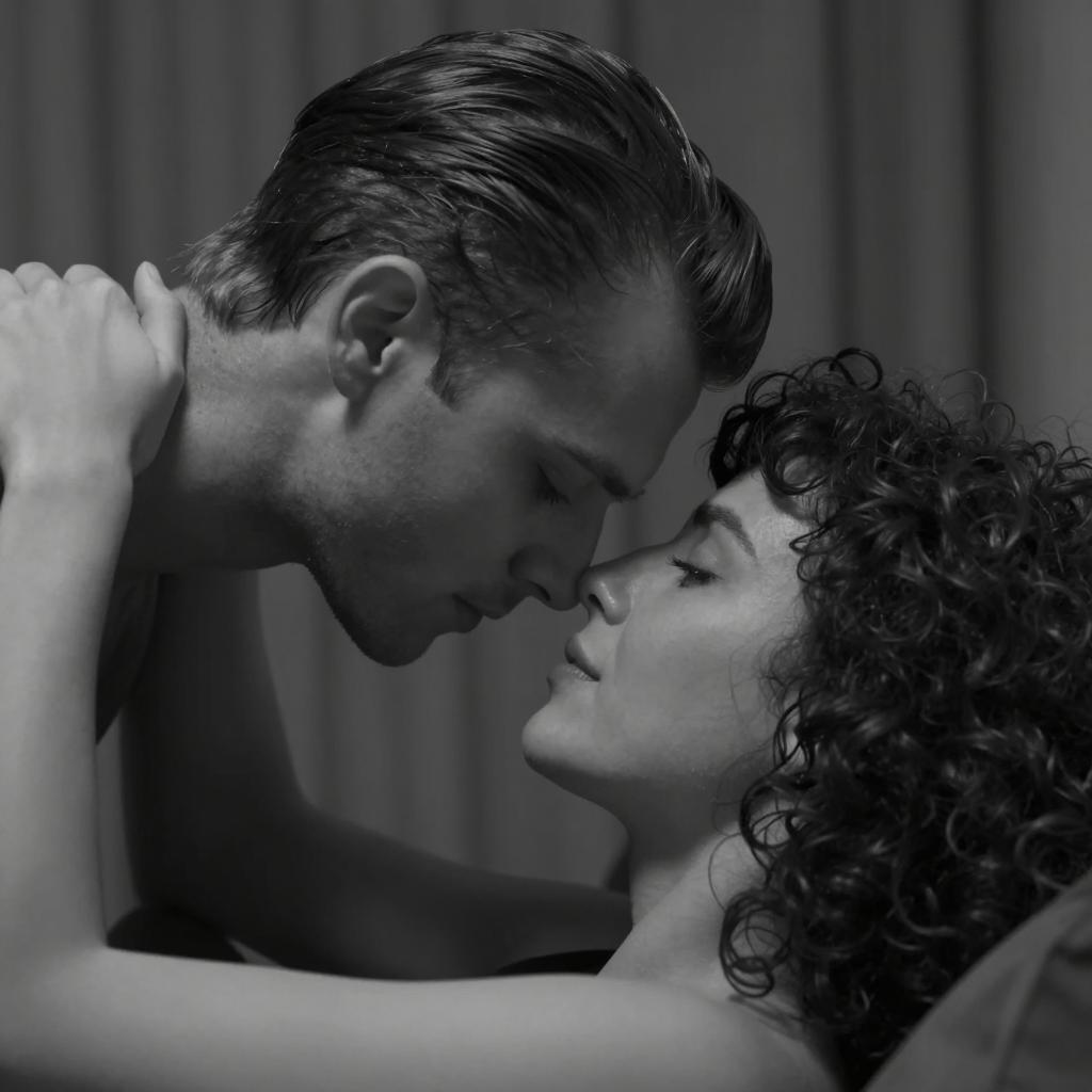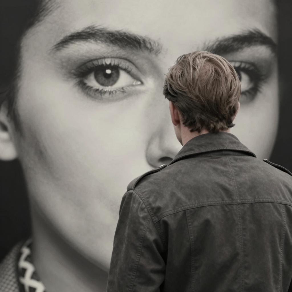 Photograph of a man with light brown, combed-back hair, seen from behind, standing in front of a large, close-up, black-and-white movie still of a woman's eye with a patterned scarf. The man wears a dark, ured jacket. The woman's eye is wide and intense.