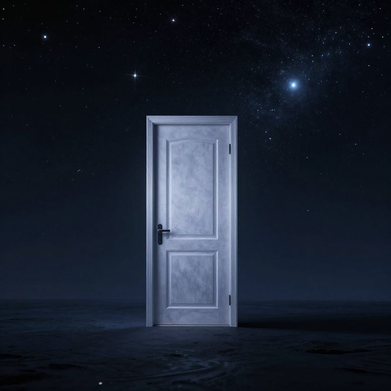 A solitary door stands defiantly in a vast, starlit expanse, its surface bathed in ethereal light from celestial bodies, defying the boundaries between the familiar and the infinite.