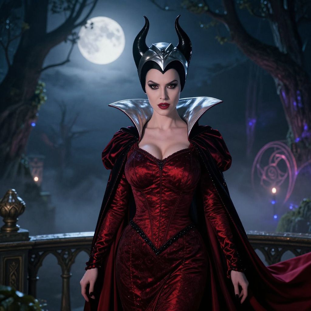 A cinematic photograph of a woman in a dark, dramatic Disney Evil Queen costume standing on a moonlit balcony overlooking a misty forest at night; she has a cold, intimidating face with deep-set brown eyes and defined jawline, her red dress flows in the wind, and the silver cowl on her head reflects the moonlight; the background includes enchanted trees and a faint glow of magical runes. The woman has big tits and cute face
