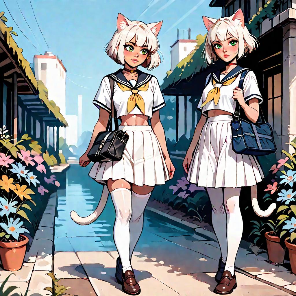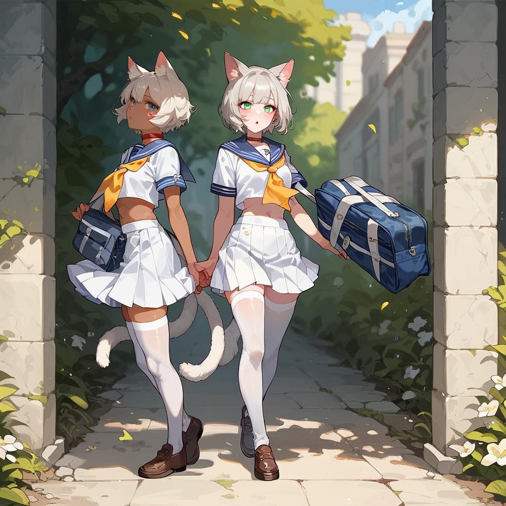 Cat Girls in School Uniforms Holding Hands