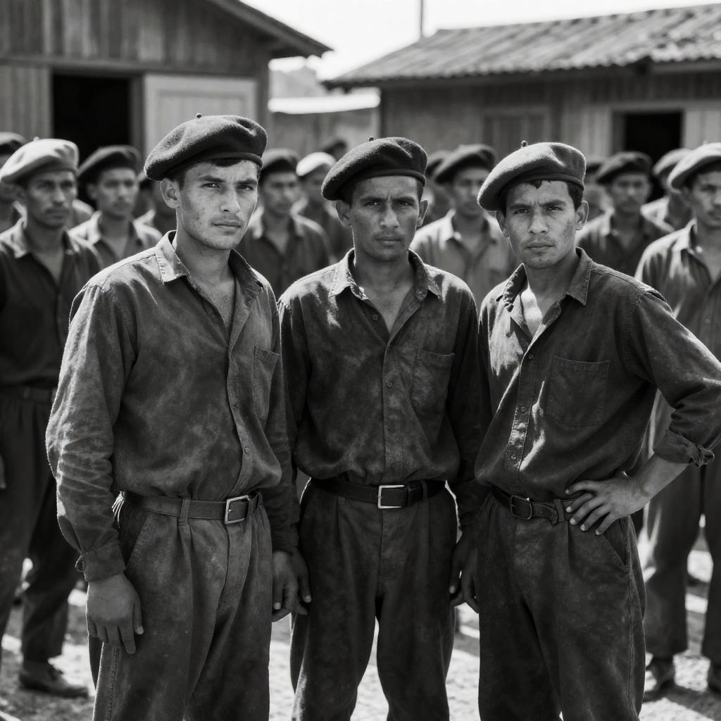 Black and white photograph of five sailors in white caps, pointing rifles in a circular formation on a sunlit street. One sailor in the center raises a flag. Shadows create striped patterns. Other sailors crouch around, some holding rifles. Street with scattered objects in background. Intense, focused expressions on sailors' faces.
