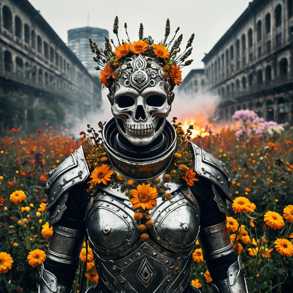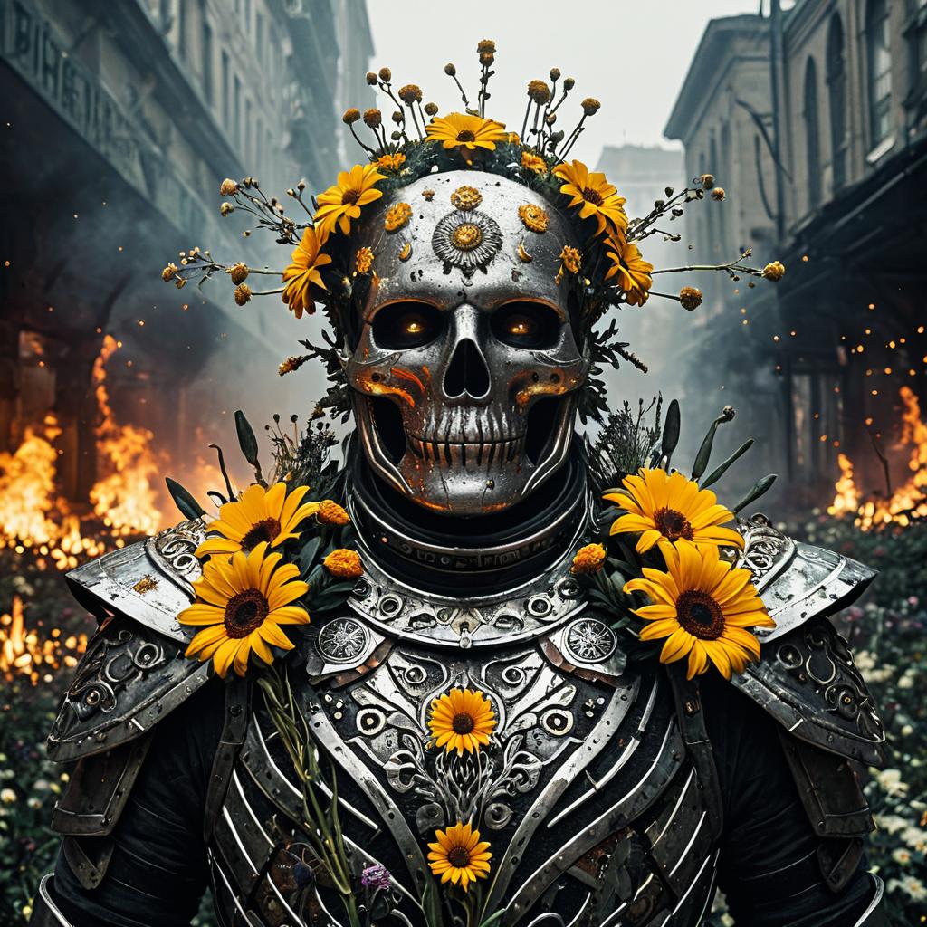 Photorealistic image of a warrior with liquid metal reflective armor and a skull-like mask, adorned with a crown of vibrant yellow and red flowers. The figure's eyes are half-closed with a gentle smile, blending a mysterious and empathetic aura. The setting features urban ruins with blooming flowers and subtle fire and spark effects in the background, creating a surreal atmosphere of decay and rebirth.
