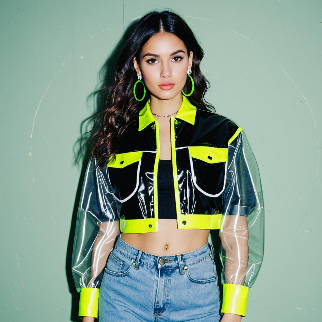 Woman, street style edge, clear PVC jacket with neon yellow trim, cropped black top with white graphic print, high-waisted blue denim jeans, green hoop earrings, neutral makeup, long wavy hair, studio background.