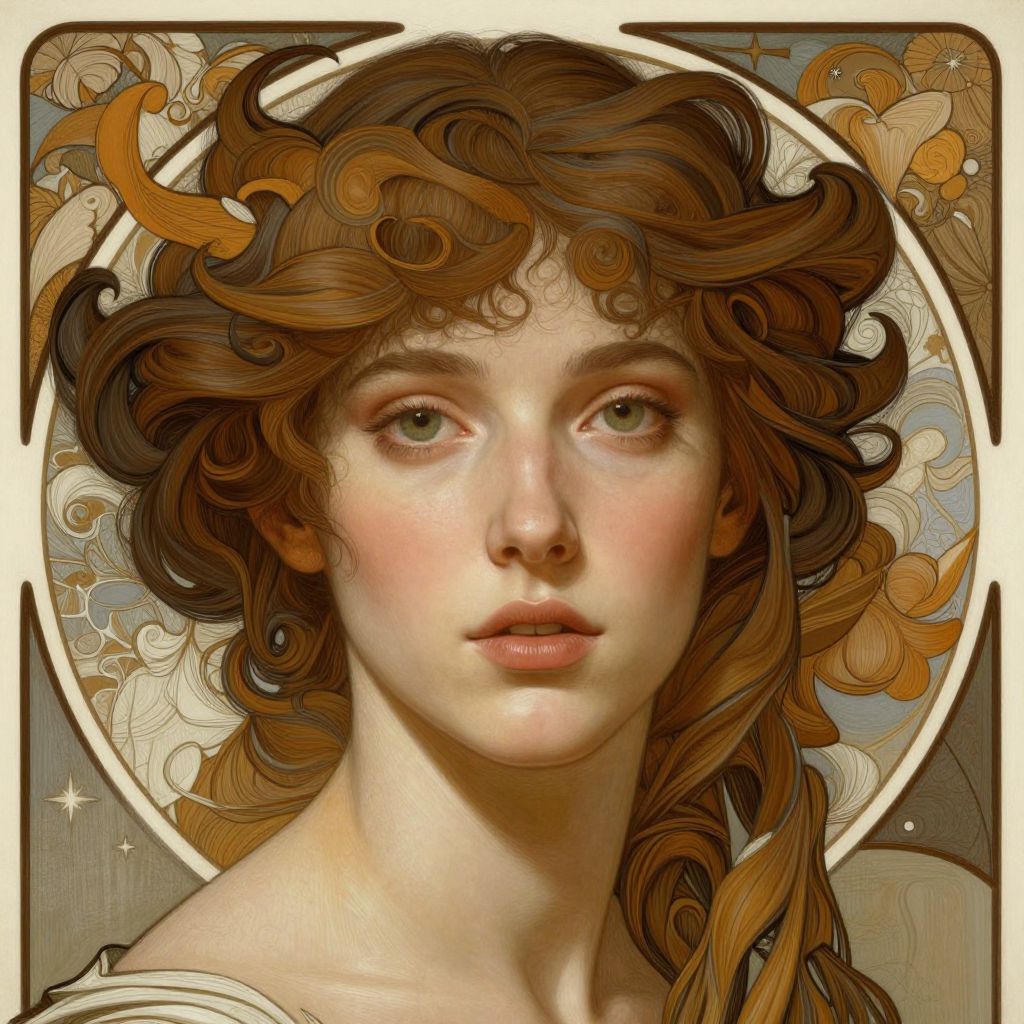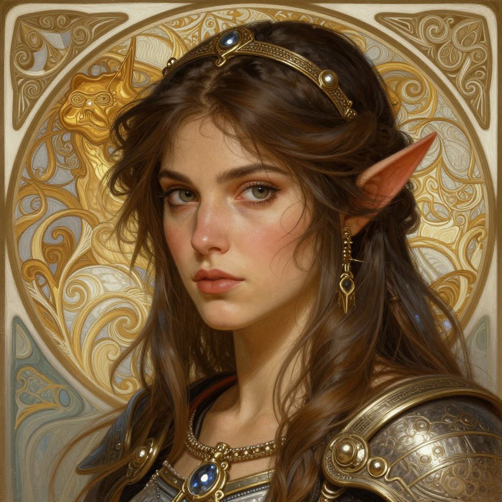 Digital art portrait of a young, fair-skinned, brown-haired elf woman with pointed ears, wearing ornate golden headpiece and jewelry. Her large, expressive blue eyes gaze forward, and her lips are slightly parted. She has a serious, determined expression. Her long hair is loosely wavy, partially tucked behind her ears. She wears a detailed, metallic armor with blue gemstones, visible on her shoulder. The background features an intricate, gold-embellished circular pattern with swirling designs. The overall style is reminiscent of fantasy art, with a focus on realism and detailed textures. The image has a rich, golden color palette.