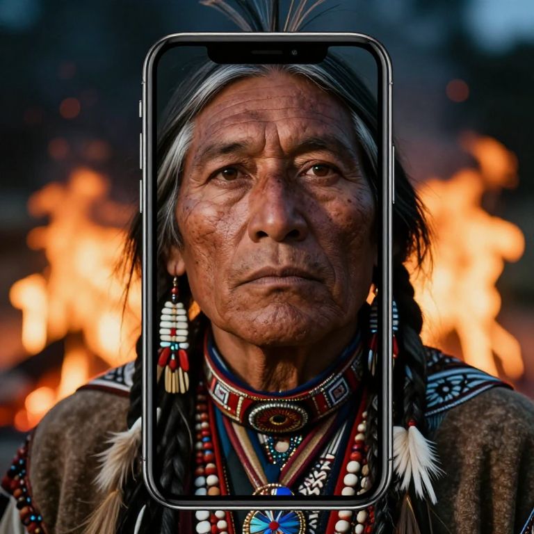 Imagine a smartphone portrait capturing an enigmatic Native American shaman's presence. His deep brown eyes and silver-streaked black hair contrast against the warm glow of a campfire in the background, illuminating his weathered features and intricate traditional attire. Shot from below eye level, this intimate perspective draws the viewer closer, highlighting the interplay of light and shadow. The portrait evokes an emotional spectrum, blending reverence for ancient wisdom with curiosity about the spiritual realm. His contemplative gaze seems to pierce through reality's veil into a world beyond our grasp.