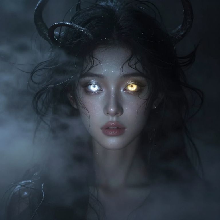 This digital artwork depicts a mysterious, ethereal woman with pale, almost luminescent skin, and striking heterochromia—her left eye glowing white, and her right eye glowing yellow. She has long, wild black hair with dark, twisted horns emerging from the top of her head. Her expression is neutral, with slightly parted lips. The background is a dark, misty blue, adding to the mystical atmosphere. The image is highly detailed with a realistic yet fantasy-style rendering, emphasizing her otherworldly appearance. The overall mood is eerie and enigmatic.