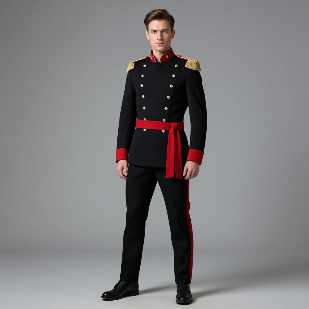 Photograph of a tall, white male with short brown hair, standing against a plain gray background. He wears a formal black military-style uniform with gold epaulettes on the shoulders, double-breasted buttons, and red accents on the cuffs, collar, and waist. A red sash is tied around his waist. His expression is serious and he stands with a straight posture, feet slightly apart. Black shoes complete the outfit. The lighting is even, highlighting the uniform's details and the subject's facial features.