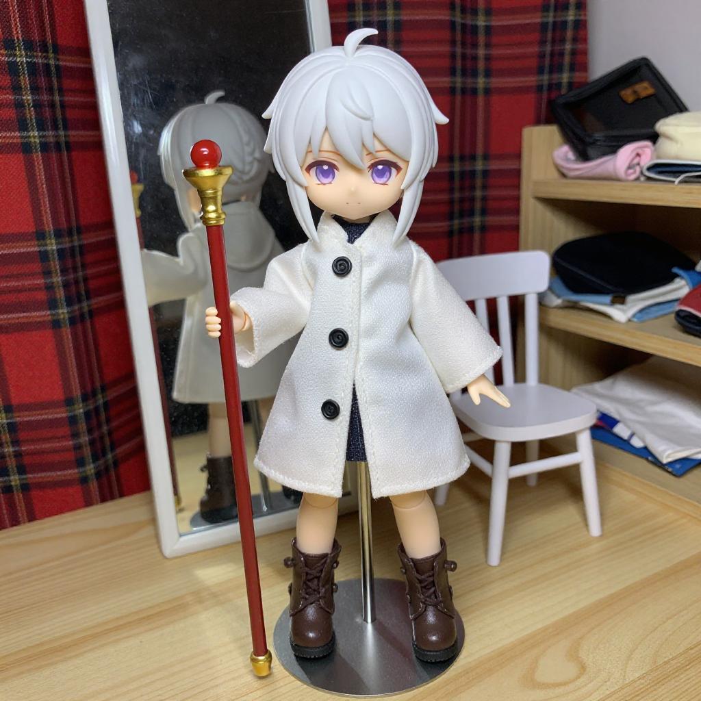 Photograph of a white-haired anime-style doll in a white coat and brown boots, holding a red and gold staff, standing in front of a mirror. Background includes red plaid curtains, a gray couch, and scattered clothes on wooden floor.