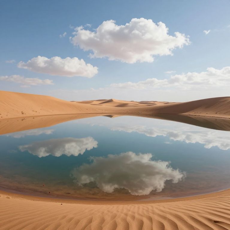 In a surreal desert landscape, a tranquil pool of water defies gravity by mirroring the sky above, its surface perfectly still yet seemingly suspended, as clouds and sand dunes reflect with uncanny clarity.