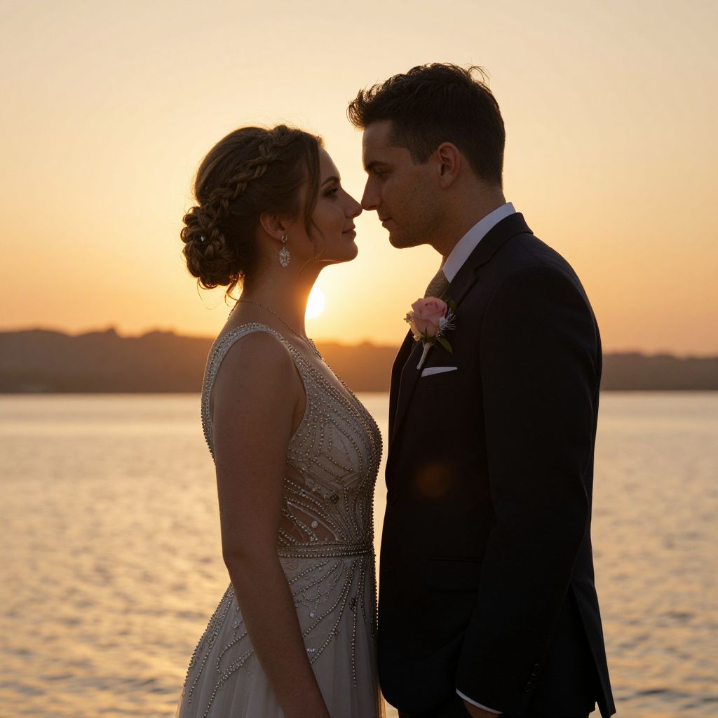 Romantic couple standing nose-to-nose against a golden sunset backdrop, with the woman wearing an elegant beaded dress and braided hairstyle, and the man in a dark suit adorned with a pink boutonniere, both gazing intently at each other near a tranquil body of water.