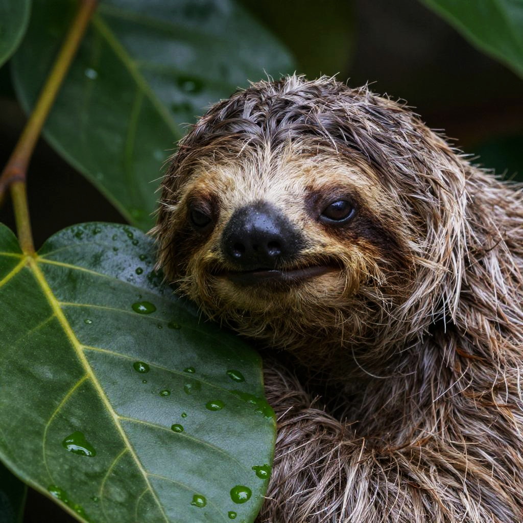 Photograph of a close-up sloth face with shaggy, wet brown and gray fur, a black nose, and a gentle smile. The sloth's eyes are dark and round. It rests against a large, green, raindrop-covered leaf with visible veins. The background is blurred, consisting of dark green foliage, highlighting the sloth in the foreground. The image has vibrant colors and a slightly overexposed effect, emphasizing the texture of the sloth's fur and the wetness of the leaf. The overall mood is serene and natural.