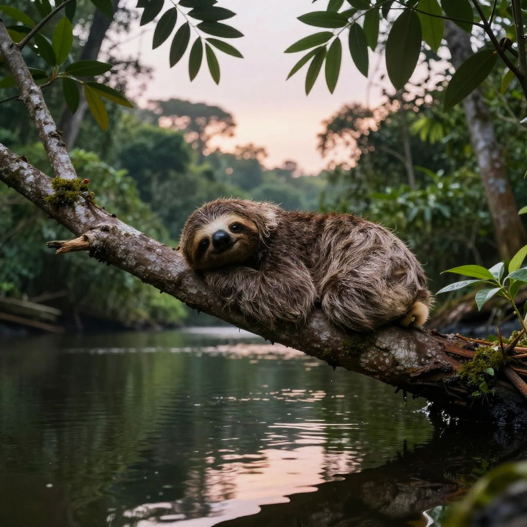 Dis the sloth depicted in close-up, focusing on expressive sleepy eyes and textured coarse fur, surrounded by dew-covered tropical leaves with intricate veins, morning light highlighting delicate features, calm and introspective ambiance