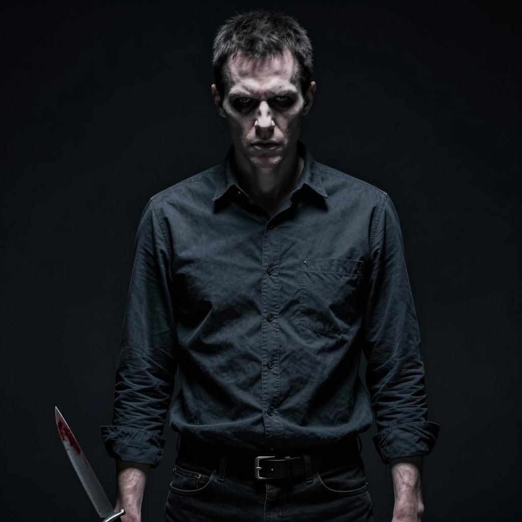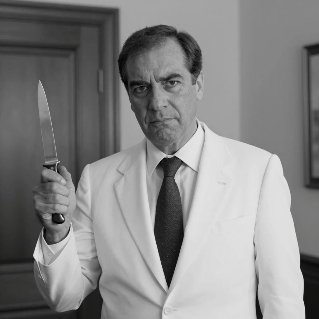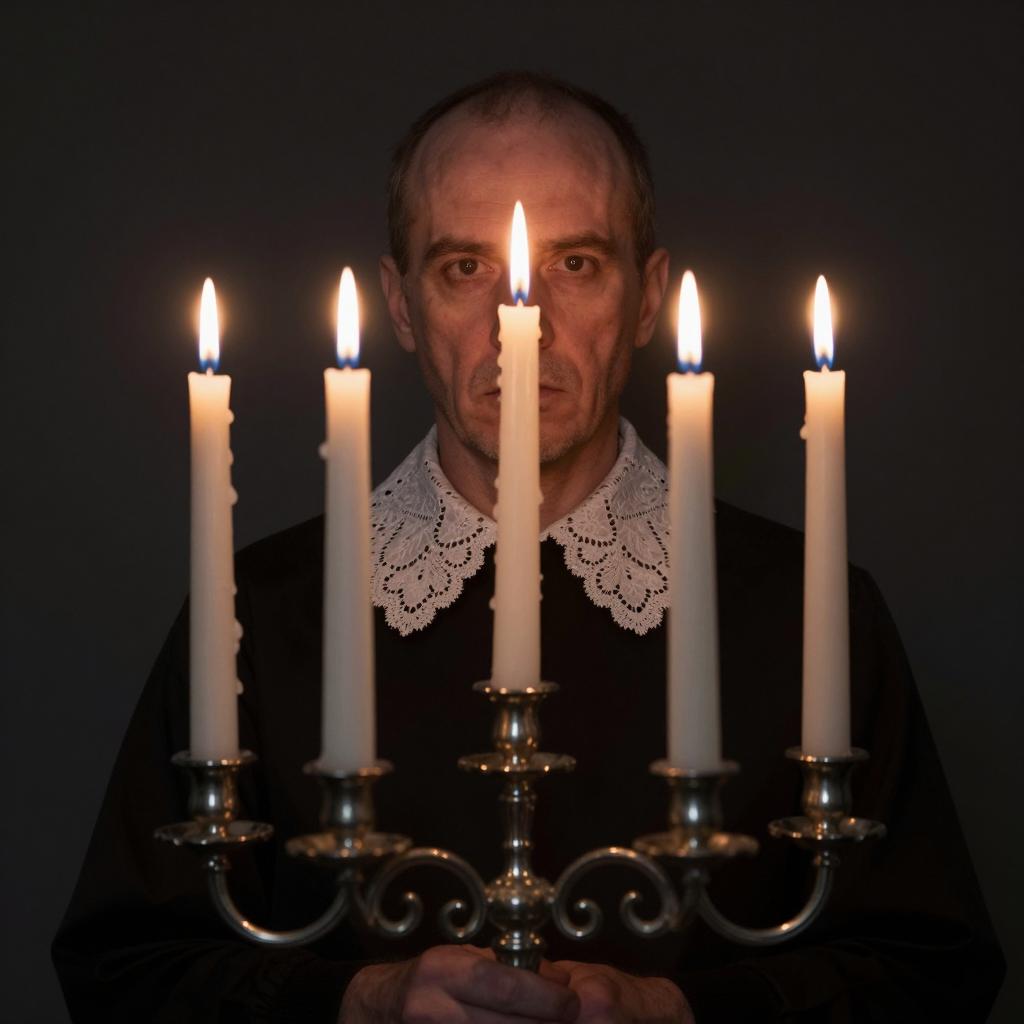 Middle-aged man with pale skin and receding hairline wears black outfit with white lace collar, holding candelabrum with five lit candles. Dark background, man's face lit by candlelight, serious expression. Five candles in a row, flames burning brightly.