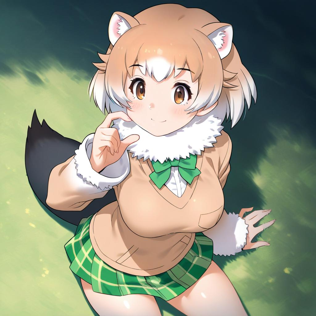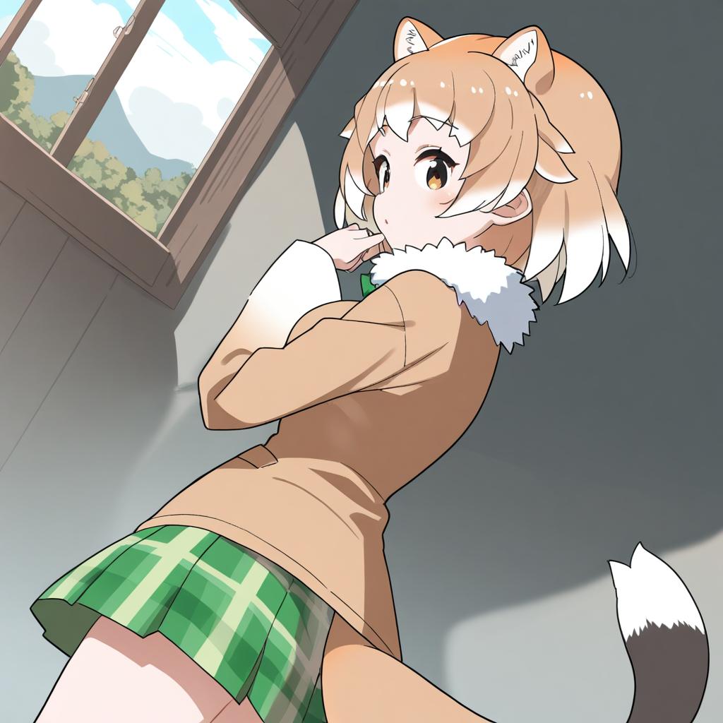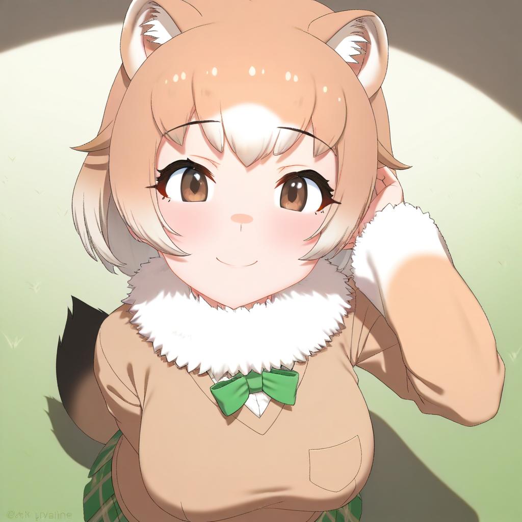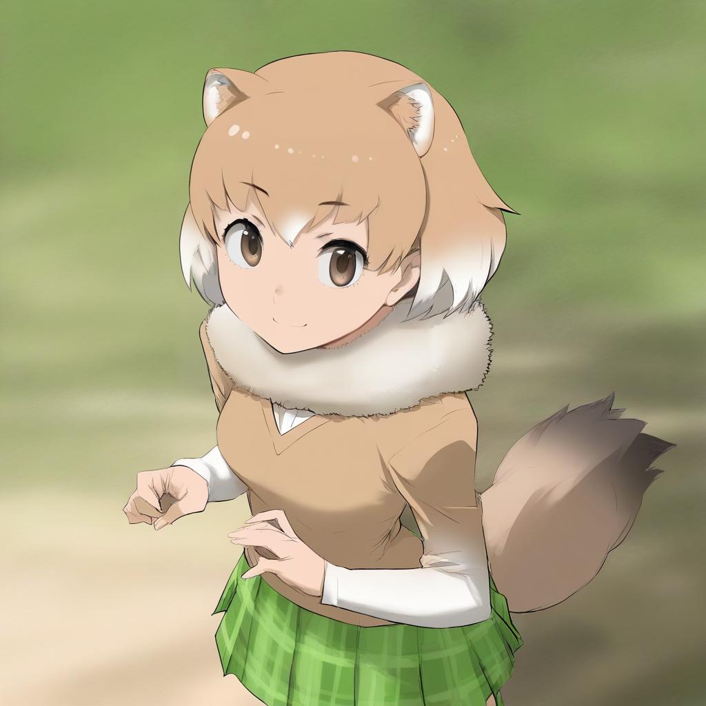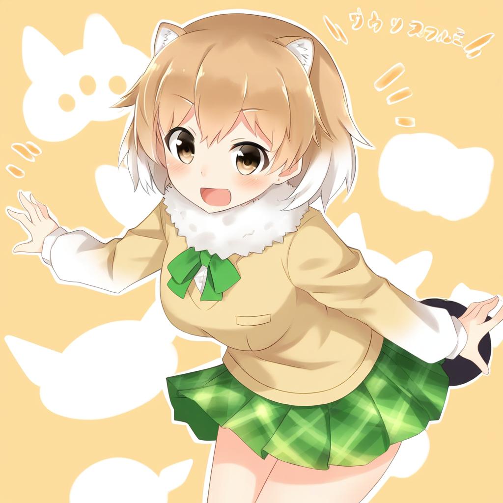 Black-tailed prairie dog (kemono friends), kemono friends, 1girl, animal ears, tail, extra ears, brown eyes, short hair, light brown hair, white hair, brown hair, gradient hair, plaid skirt, pleated skirt, fur collar, long sleeves, by artist keita naruzawa, illustrious