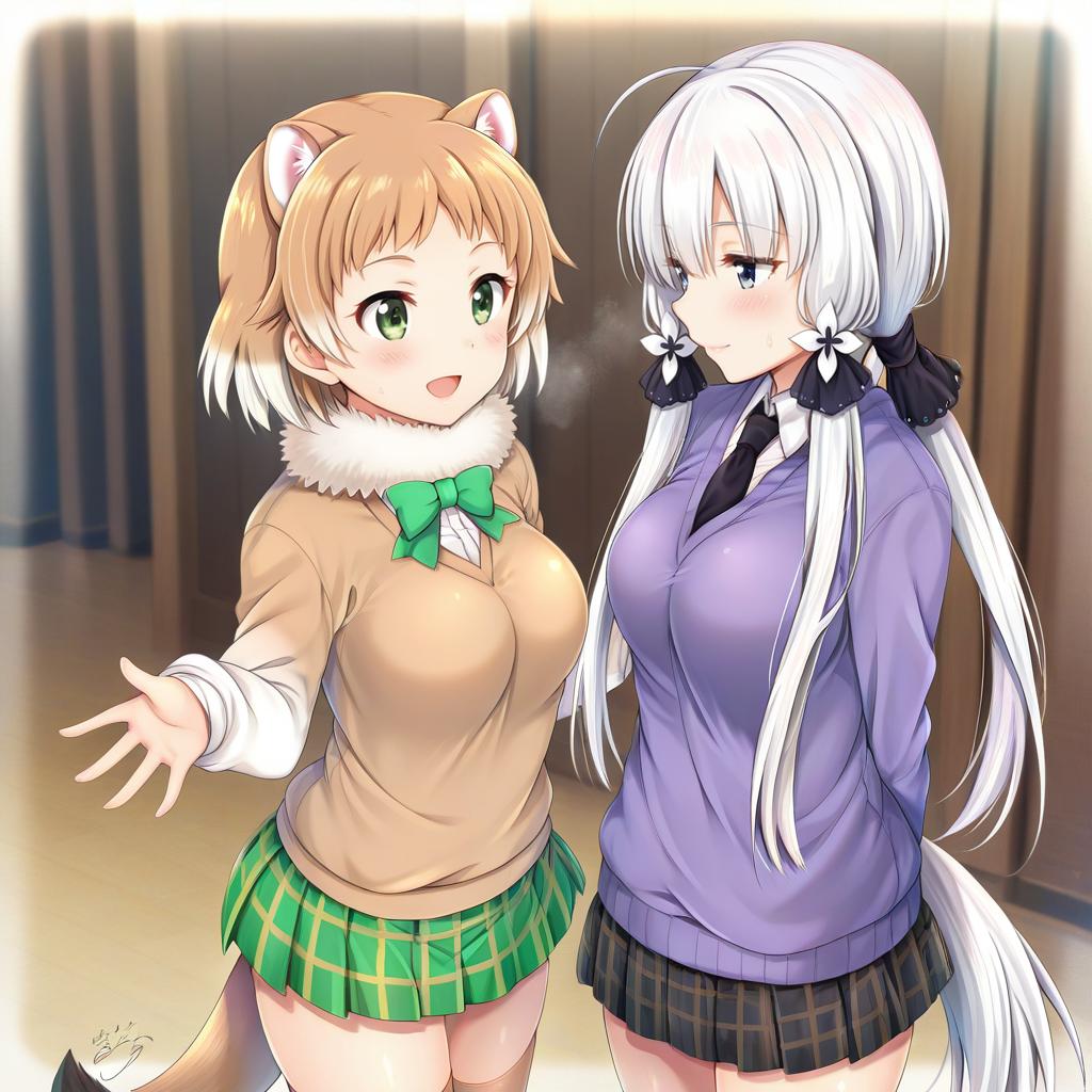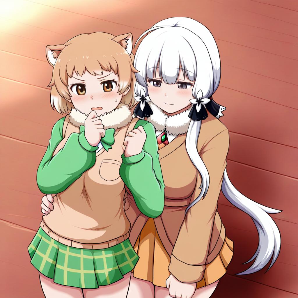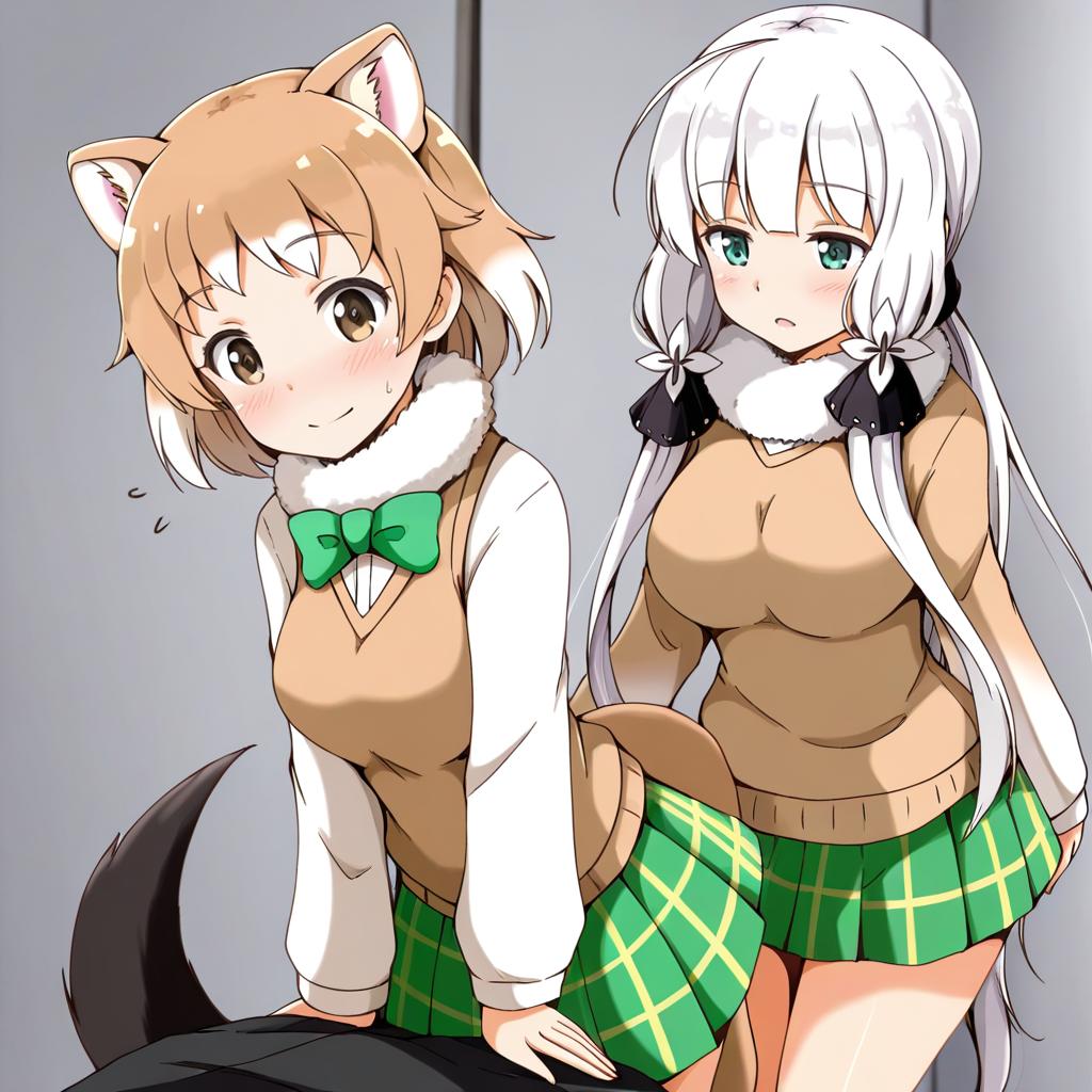 Digital anime-style illustration featuring two female characters inspired by Kemono Friends. One character has short light brown hair, animal ears, brown eyes, and wears a green plaid pleated skirt with a beige vest and fur collar. The other character has long white hair with ribbon accessories, a beige outfit with a fur collar, and a long white tail. The scene has a warm background with wooden textures.
