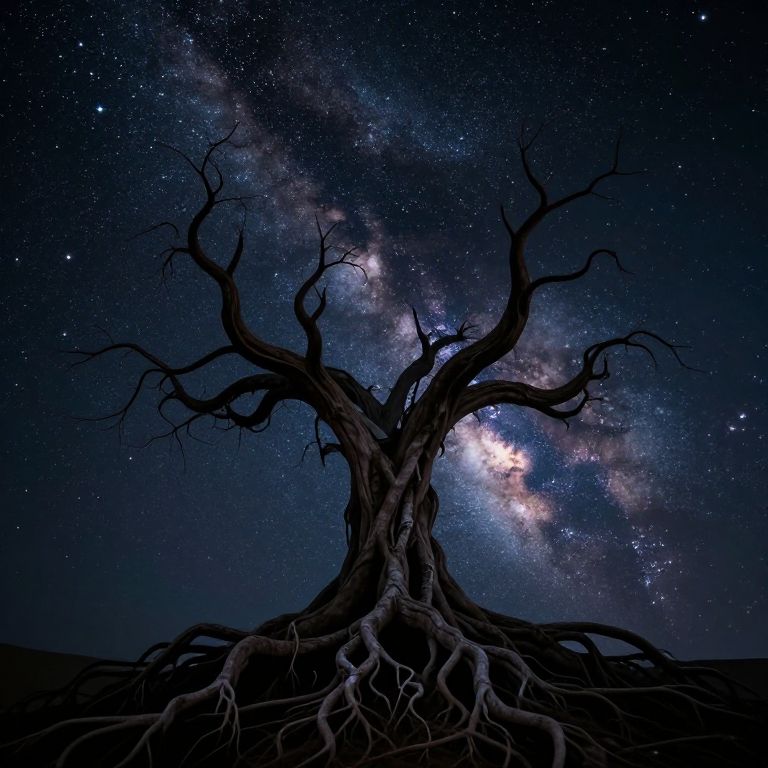 Roots reach skyward like celestial tentacles, weaving a tapestry of hope and wonder beneath a starlit canopy, where the earth whispers secrets of eternity to the cosmos.