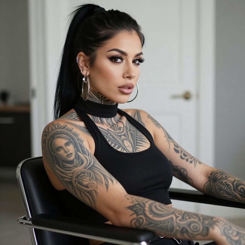 Photograph of a tattooed woman with dark hair in a high ponytail, sitting in a black chair. She has extensive black and gray tattoos covering her arms, neck, and chest. She's wearing large hoop earrings and a black top with a high collar. Her right arm is extended, showing intricate tattoo work. The background is a blurred indoor setting with white walls and a door.