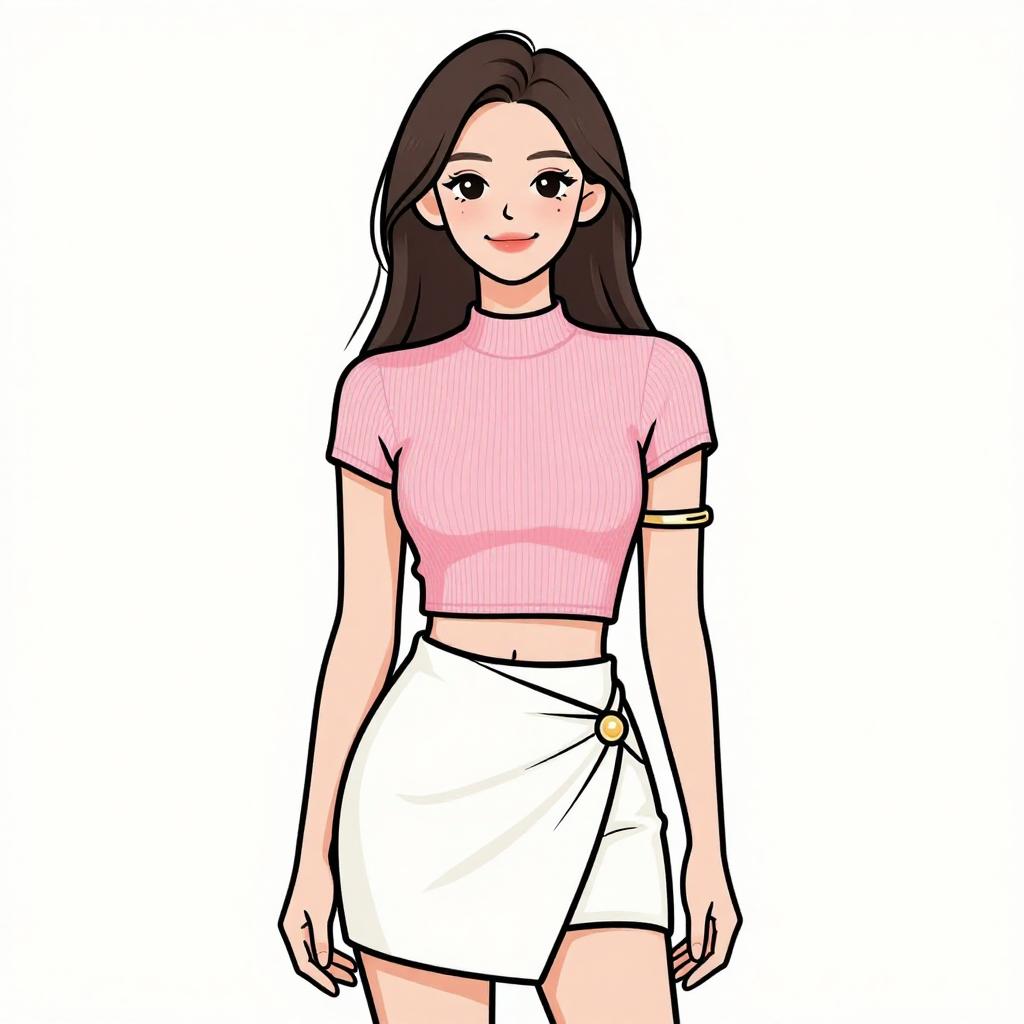Woman with pretty face and pretty hair. smiling Woman, contemporary minimalist, pale pink ribbed mock neck crop top with short sleeves, white asymmetrical wrap mini skirt, delicate gold bangle, small gold upper arm cuff bracelet, white background. --sref 1467