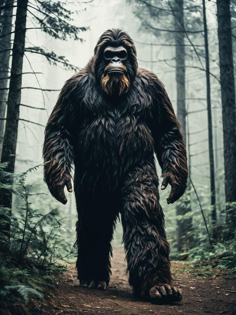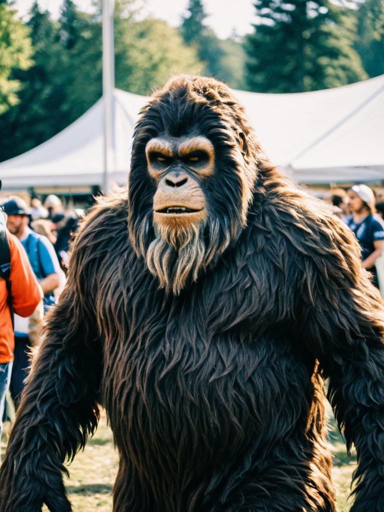 A man dressed in a detailed Bigfoot costume walking at an outdoor festival. The costume features long brown fur, exaggerated hands and feet, and a mask with a gorilla-like face. The background shows a crowd of festival attendees, tents, and a forested area.