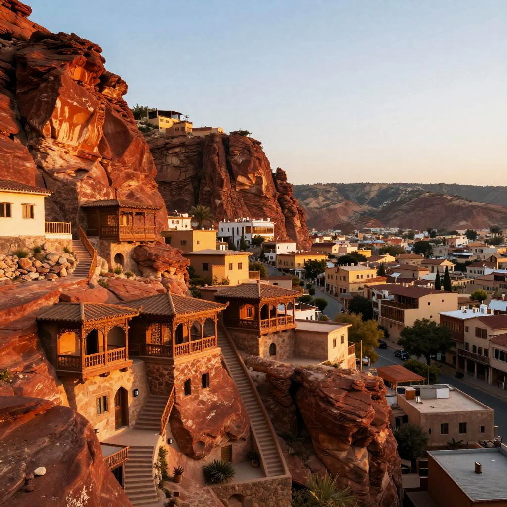 Midjourney architecture prompts illustrating a sprawling urban landscape built into towering red rock cliffs, with homes carved directly from stone, ornate wooden balconies, and narrow winding staircases, bathed in warm golden sunset light for a harmonious blend of natural and engineered elements.