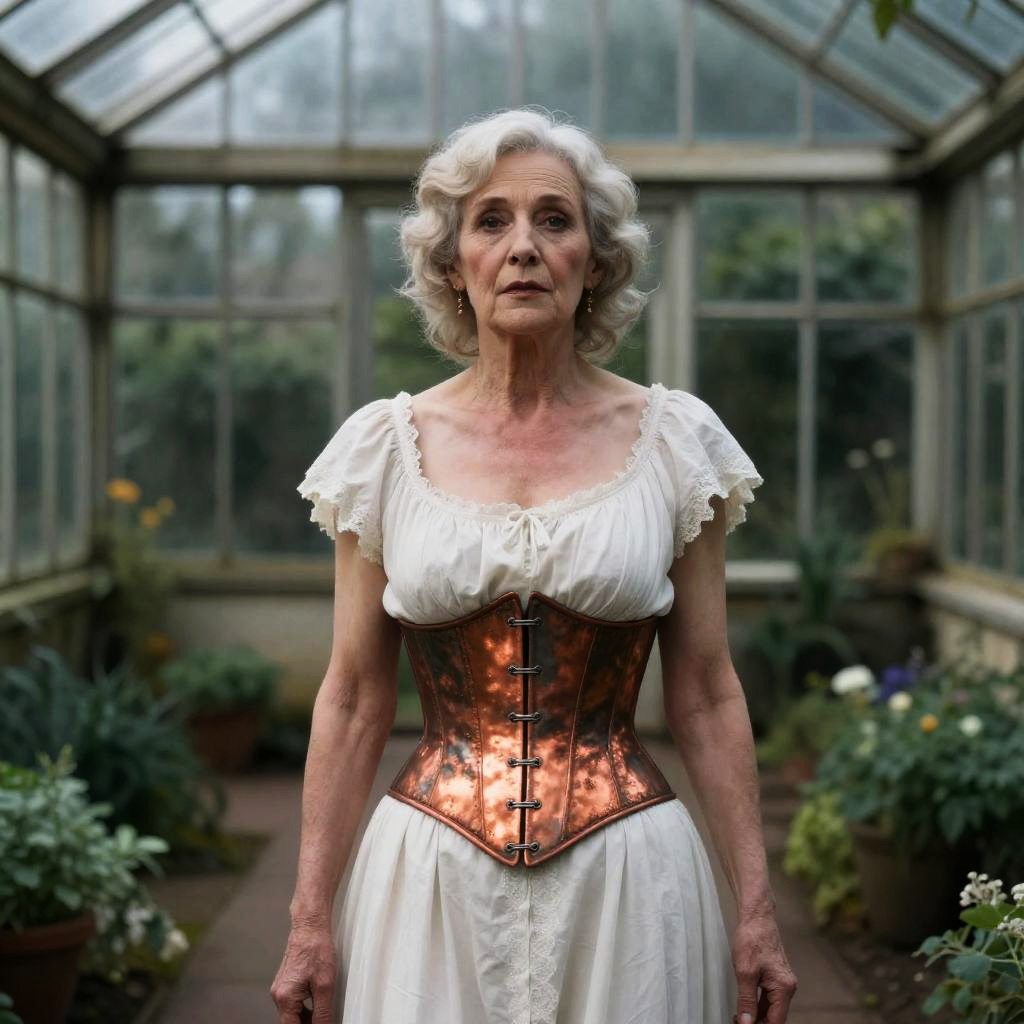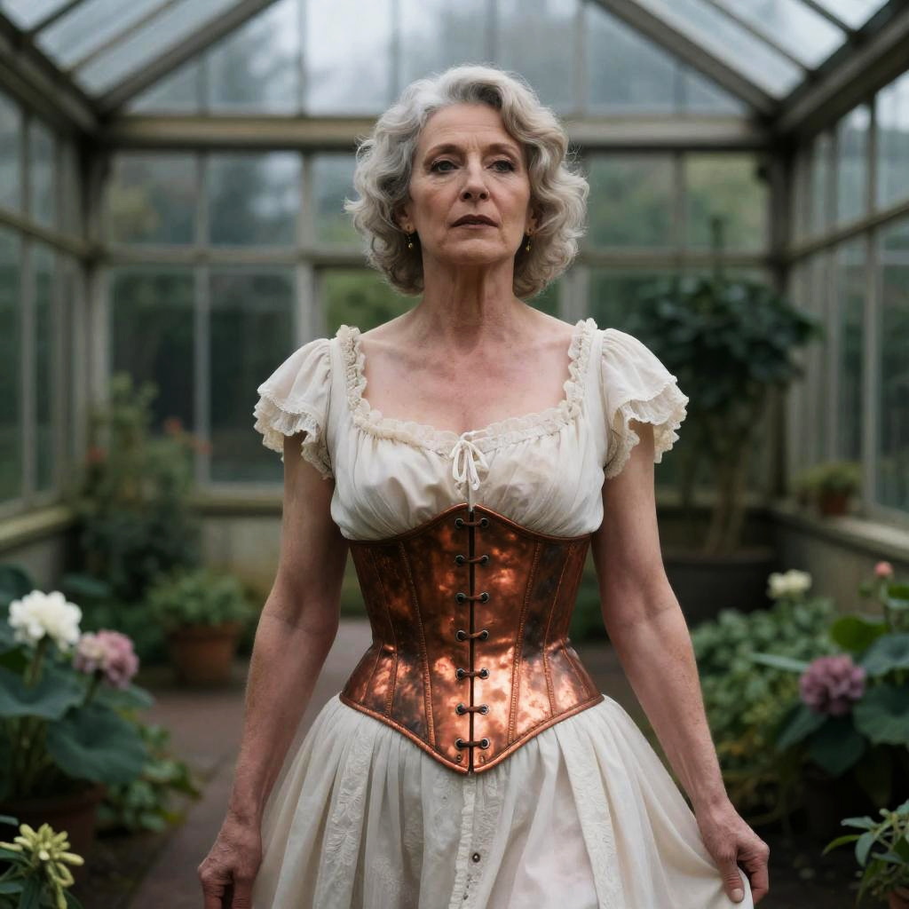 Retired circus performer in a patinaed copper corset-style belt, cinching her dress in an overgrown Victorian greenhouse at twilight