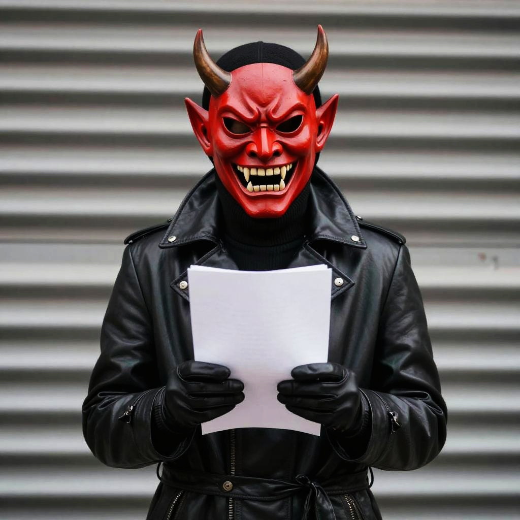 A photograph of a person with a bright red, painted-on demon mask, standing outdoors. They're wearing a black, shiny leather coat with high, stiff shoulders, and black gloves, holding a white paper in front of them. The background features blurred, horizontal metal slats. The person's red mask has exaggerated features like sharp teeth and deep-set eyes, adding a spooky vibe to the image.