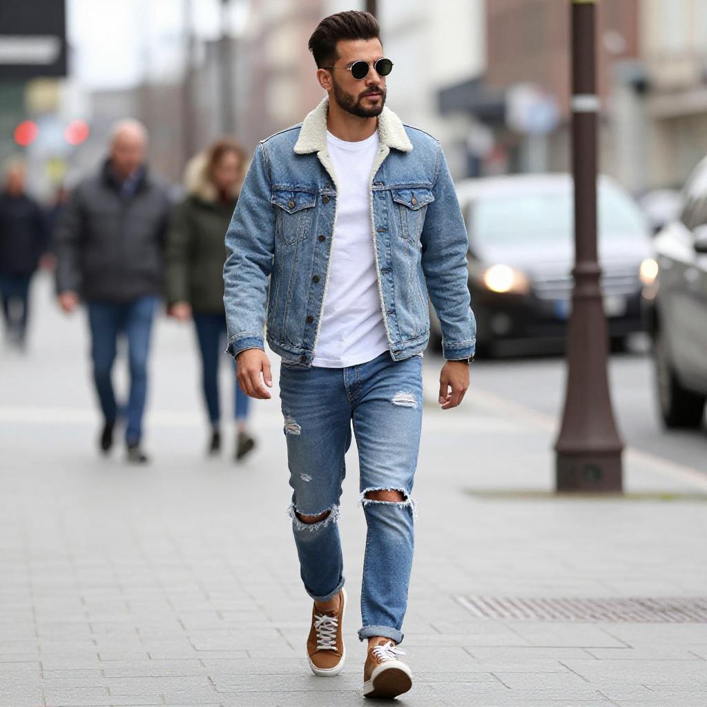Photograph of a stylish man walking down a city street, taken from a slightly low angle. He's wearing a light blue denim jacket with a shearling collar, white t-shirt, ripped blue jeans, and brown sneakers. He has dark hair, a beard, and is wearing round sunglasses. The background is slightly blurred, showing a few pedestrians and cars. Lighting is natural, overcast. Depth of field keeps the subject in sharp focus while the background is softly blurred.
