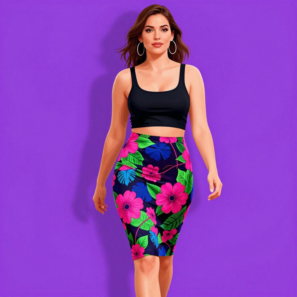 Digital illustration of a confident woman with fair skin and wavy brown hair, wearing a black crop top and high-waisted, form-fitting pencil skirt adorned with vibrant pink and blue floral patterns and green leaves. She has hoop earrings and is walking against a solid purple background. The style is vivid and colorful, with a modern, fashion-forward aesthetic. The woman's expression is neutral, and she is positioned centrally, facing forward with her arms relaxed by her sides.