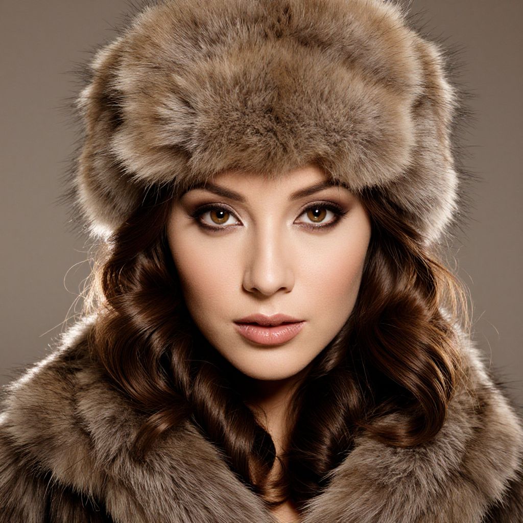 The image features a striking portrait of a woman with captivating eyes that exude a sense of mystery and allure. She is adorned in a luxurious fur hat and coat, which add a touch of elegance and warmth to her appearance. The fur is rich in texture, with varying shades of brown and beige, creating a visually appealing contrast against her skin. Her hair, styled in soft waves, cascades gently around her shoulders, adding to the overall softness of the image. The lighting is soft and warm, highlighting the contours of her face and the intricate details of the fur. The background is a muted, neutral tone, which ensures that the focus remains on the woman and her attire. The composition is balanced, with the woman's face centered and the fur hat framing her face, drawing the viewer's attention directly to her expressive eyes. The overall effect is one of sophistication and grace, with the fur elements adding a layer of luxury and depth to the portrait.