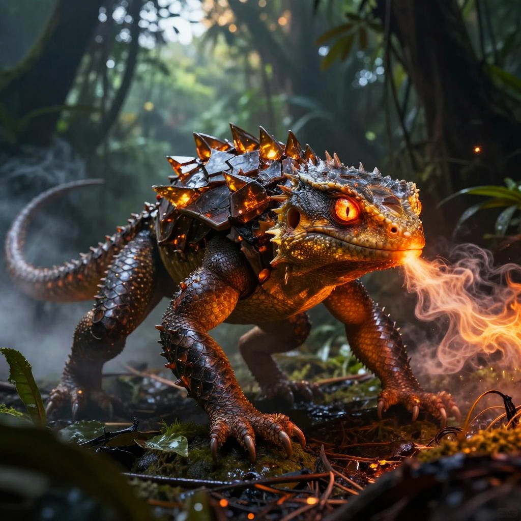 Ember-lizard creature with fractured amber armor and smoldering eyes, lunging forward expelling a trail of fiery smoke, dense jungle littered with scorched vegetation at dusk, action shot, skin pores, very dark lighting, heavy shadows, detailed face, vibrant, photorealistic, dramatic, sharp focus, 8k, (intricate:1.4), decadent, (highly detailed:1.4), digital painting, concept art, octane render, artstation, smooth illustration, global illumination, studio light, volumetric light, atmospheric fog, particles floating, embers, wet surfaces, rim light, depth of field