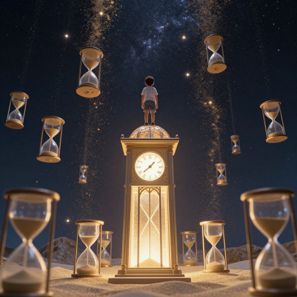 A child stands atop a luminous, suspended clock tower, surrounded by cascading hourglasses that scatter golden sand like stars, defying gravity in a dreamlike celestial realm.