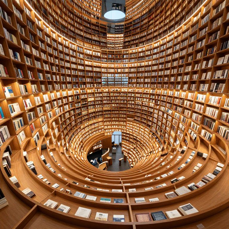 Photograph of a vast, circular library with concentric wooden shelves spiraling upward and inward, filled with uniformly arranged books. Warm, yellowish overhead lighting casts a cozy glow. A single, modern, cylindrical light fixture hangs from the ceiling in the center. The circular arrangement creates a mesmerizing, tunnel-like effect. The lower shelves have small, open spaces for books and papers, with some books slightly ajar. The image emphasizes the library's architectural design and the meticulous organization of its vast collection. The overall atmosphere is one of academic serenity and intellectual pursuit.
