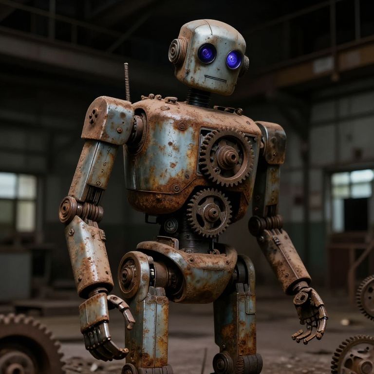 Dusty old robot standing in an abandoned factory, rusty metal parts, broken gears, dim lighting, vintage sci-fi atmosphere, intricate details, cinematic angle