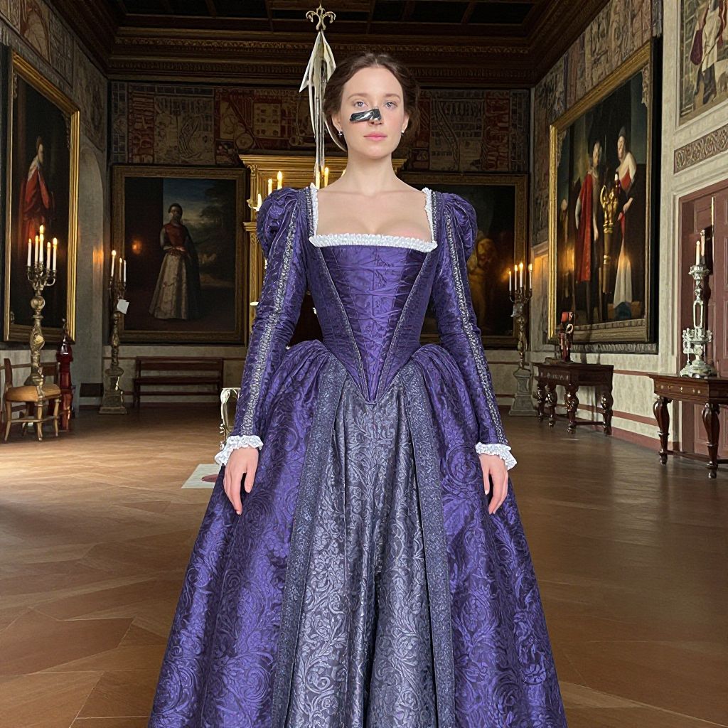 A tall, elegant woman with fair skin and a prominent nose, wearing a majestic purple renaissance dress with intricate lace detailing and a corseted bodice, poses in front of a Renaissance-era manor hall filled with candlelight, paintings, and tapestries on the walls.. The woman has big tits and cute face
