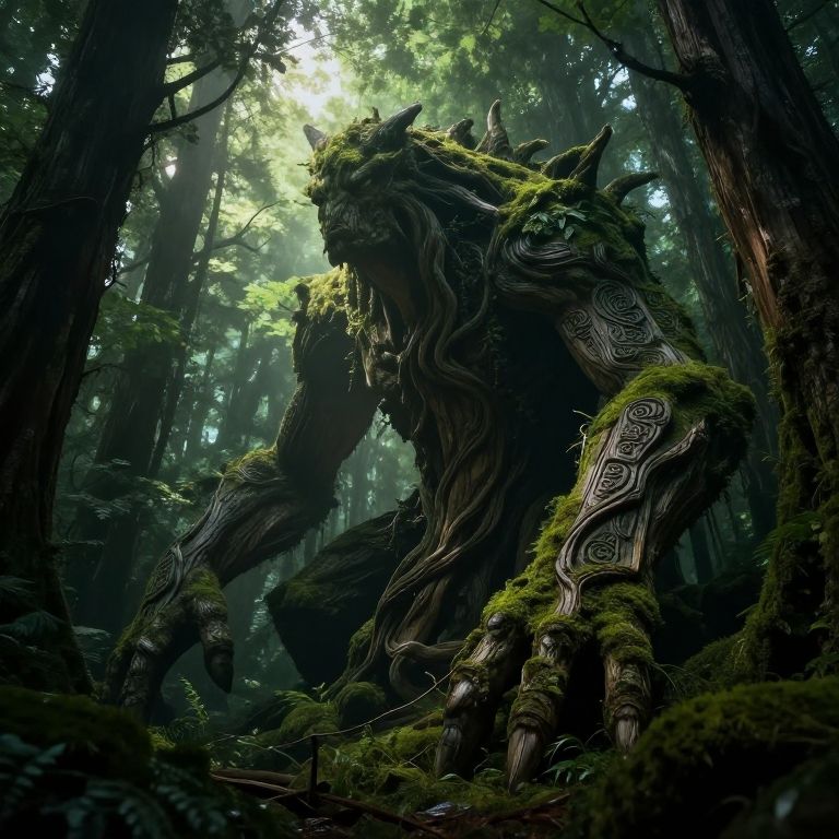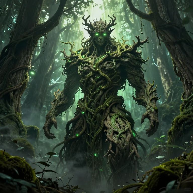 A towering fantasy figure composed of intertwined ancient trees and vines, with glowing green eyes. The mythical forest guardian stands amidst a misty, dense woodland with ethereal light beams filtering through the tall trees. Rich textures highlight the detailed wooden and plant-like features of the guardian, blending seamlessly with the natural environment.