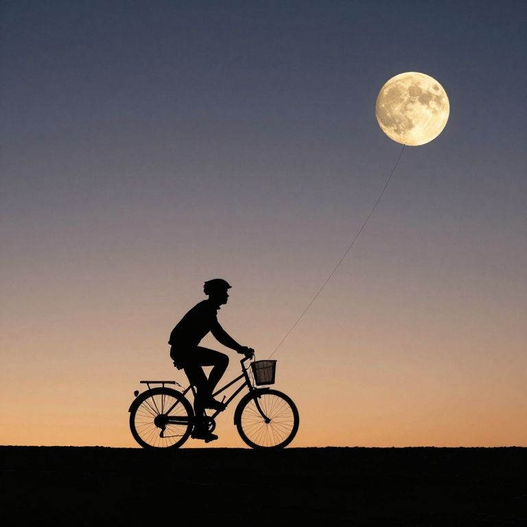 A surreal digital artwork depicts a silhouette of a person riding a bicycle suspended in mid-air, powered by a golden moon floating in a basket, set against a gradient sky over a textured desert landscape, evoking a dreamlike and ethereal atmosphere.