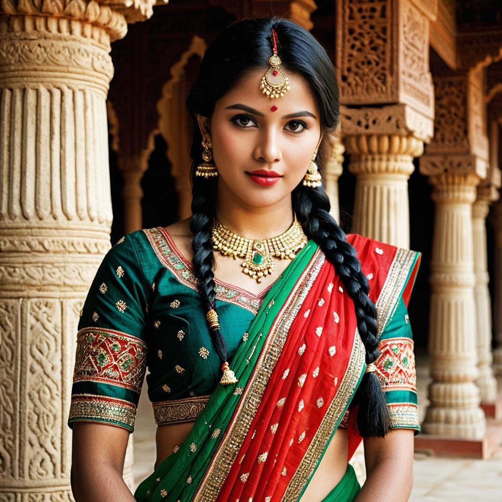 Portrait of a beautiful Indian woman wearing a traditional red and green saree with gold embroidery standing outdoors in front of an ancient temple with carved stone pillars. She has medium skin tone, dark hair styled in a bun, and is adorned with gold jewelry including earrings, necklaces, and bangles. The setting is bathed in warm sunlight and features architectural elements of an Indian temple in the background.