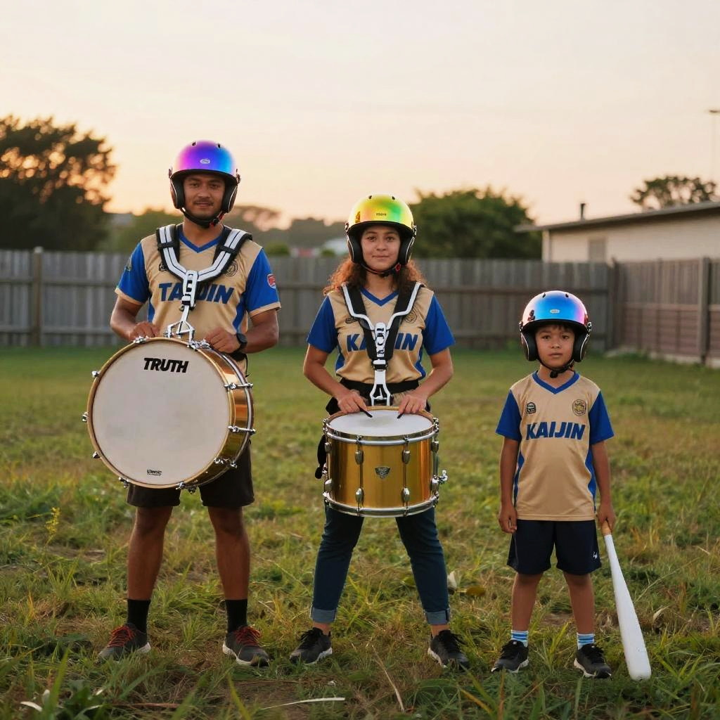 Photograph of three people standing on a grassy lawn during sunset. They're all wearing colorful, shiny helmets and matching tan and blue sports jerseys with "TRUTH" and "KAIJIN" on them. The man on the left holds a large gold bass drum with "TRUTH" on it, the woman in the middle has a smaller gold drum, and the little boy on the right is holding a white bat. The background shows a wooden fence and some greenery.