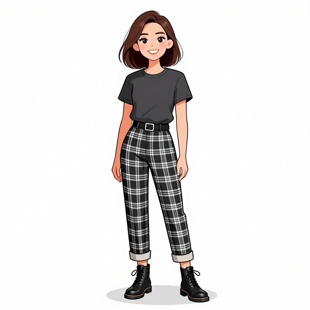 This digital illustration features a smiling young woman with fair skin and shoulder-length brown hair. She wears a black short-sleeve t-shirt, black and white plaid high-waisted pants with rolled cuffs, and black high-top sneakers. Her black eyes are large and expressive, and she has a small, subtle blush on her cheeks. The background is plain white, emphasizing her casual, modern outfit. The art style is clean and vibrant, with bold lines and flat colors, reminiscent of contemporary cartoon or anime aesthetics.