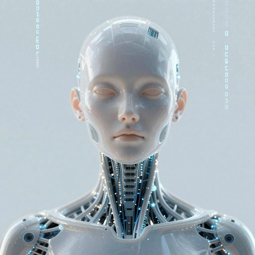 This is a digital CGI rendering of a futuristic, humanoid robot with a female appearance. The robot has a transparent, geometrically patterned head with glowing blue lines and a sleek, metallic neck. Its eyes are closed, and its face is smooth with subtle, feminine features. The shoulders and upper chest are metallic with intricate circuitry visible. The background is a bright, white gradient, enhancing the robotic figure's glowing elements. Vertical, blue, digital text lines flank the robot's head, adding a tech-inspired aesthetic. The overall style is high-tech and futuristic, emphasizing synthetic and mechanical design elements.