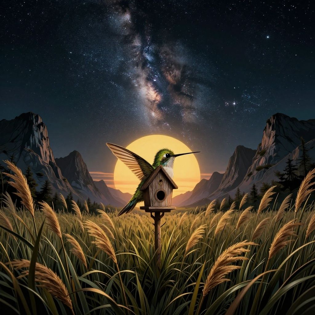 Digital artwork depicts a vivid night scene: a green hummingbird with outstretched wings perches on a small birdhouse in a field of tall, golden grass. Behind, a massive, glowing yellow full moon illuminates the landscape, with dark, jagged mountains flanking both sides. The star-studded Milky Way galaxy stretches across the dark, starry sky above. The textures are rich, with the grass blades detailed and the mountains shadowed. The birdhouse is centered, with the hummingbird in sharp focus, creating a striking contrast against the celestial backdrop. The overall style combines realistic elements with a surreal, dreamlike quality.