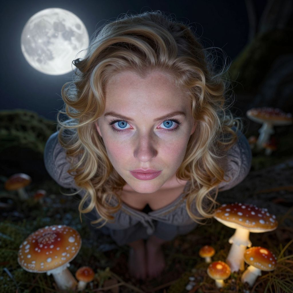 Envision a portrait captured by a digital camera, revealing a European woman's intense blue eyes and golden-blonde locks flowing in soft waves. Illuminated by the ethereal light of a full moon, her serene expression emanates tranquility amidst an otherworldly atmosphere. From above, this unique perspective showcases her standing gracefully among luminescent mushrooms, their vibrant colors blending nature's beauty with an enigmatic allure.