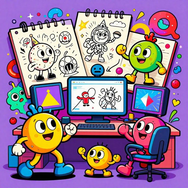 Vibrant cartoon illustration of colorful, cheerful, anthropomorphic characters drawing on computers, surrounded by sketchbooks and colorful splashes, set against a purple