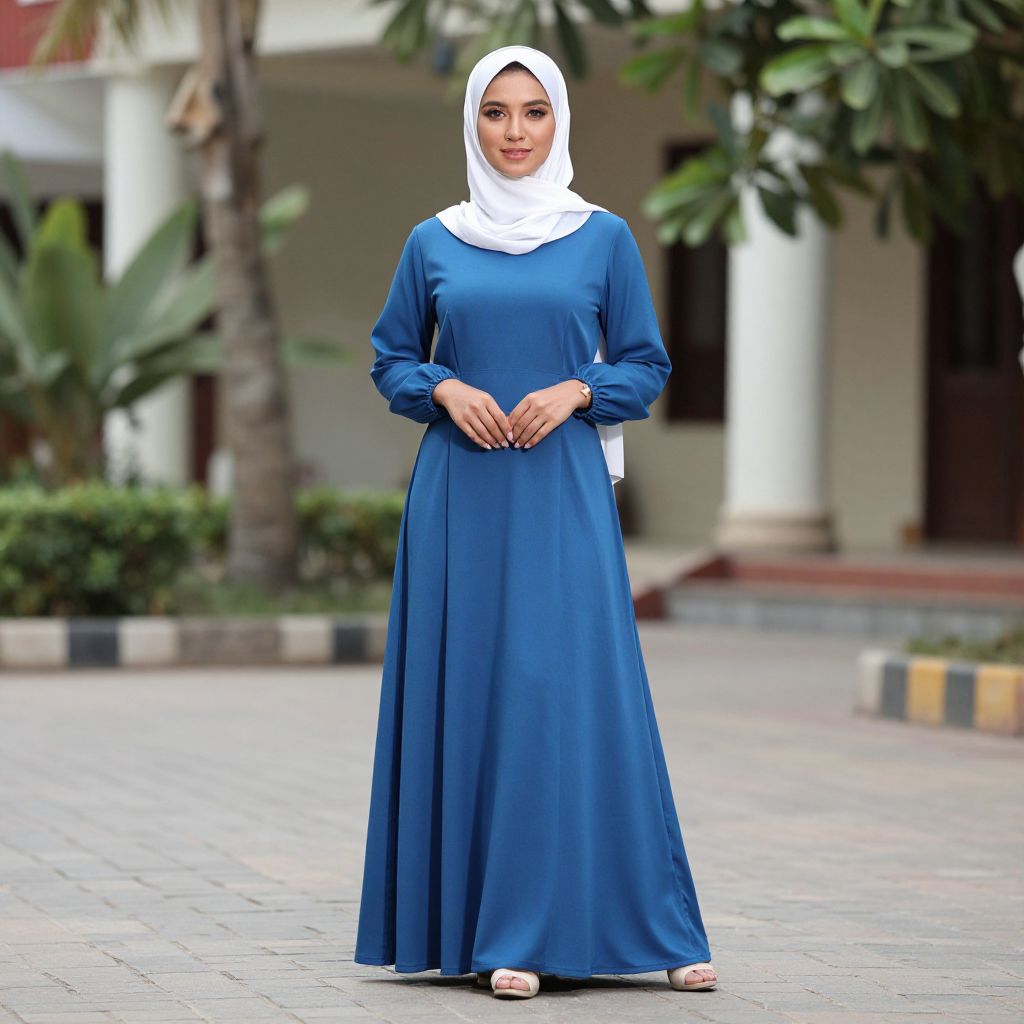 Photograph of a young woman with light brown skin, wearing a white hijab and long blue dress, standing outdoors on a paved path with greenery