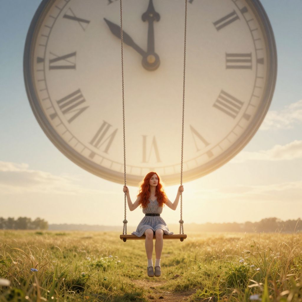 An enchanting surreal landscape captures a young woman with vibrant red hair thoughtfully seated on a swing, suspended from an enormous clockface defying gravity. The scene gracefully transitions from the ethereal glow of the timepiece into the radiant warmth of a distant, sun-kissed meadow. As one's perspective shifts to a close-up view, they are enveloped in an emotional voyage that transcends temporal boundaries, instilling both intrigue and awe at the mysterious amalgamation of dreamscape and reality.