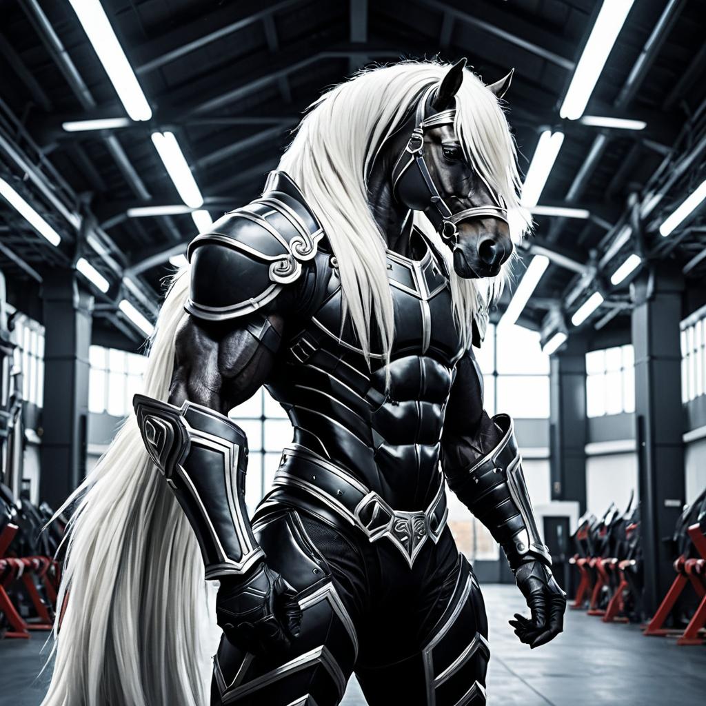 An enormously muscular black - coated anthro horse wearing skintight armor, long white mane, high - tech facility background, highly detailed, digital painting, artstation, concept art, illustration, art by artgerm, greg rutkowski, wlop