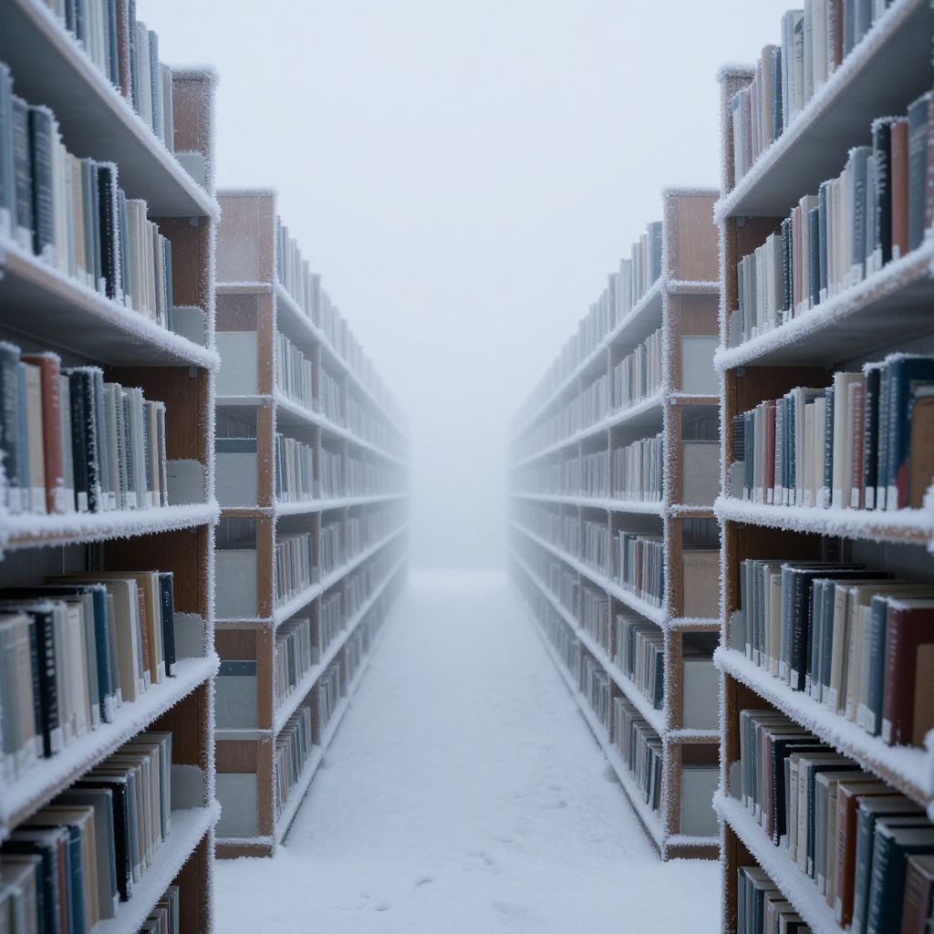 A snow-laden library aisle stretches into an ethereal mist, where frosty bookshelves stand sentinel over a silent, frozen passage, defying the warmth of human knowledge.