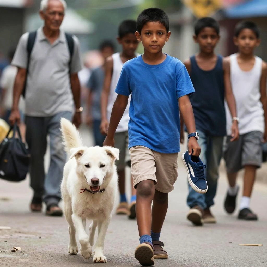 Dog, white hair, walking, shorts, shirt, outdoors, short hair, pants, watch, tank top, wristwatch, shoes, 1boy, blue shirt, male focus, old, photo background, holding, sneakers, blurry, bag, blurry background, old man, multiple boys, dark skin
